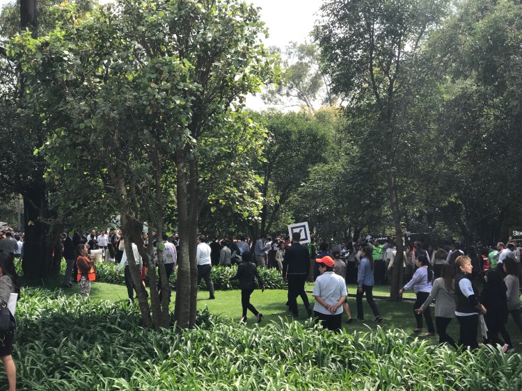 Abandonamos edificios públicos y privados. Salimos a la calle y los puntos de reunión, siguiendo a los encargados designados con sus chalecos fosforescentes. Chacoteamos un rato, algunos viendo nuestros relojes para poder continuar con nuestras actividades del diario, todos con los ojos puestos en nuestros teléfonos.